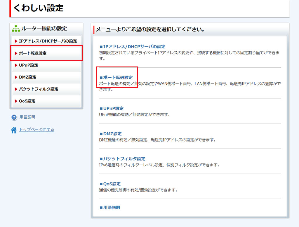 [ポート転送設定]をクリックします。