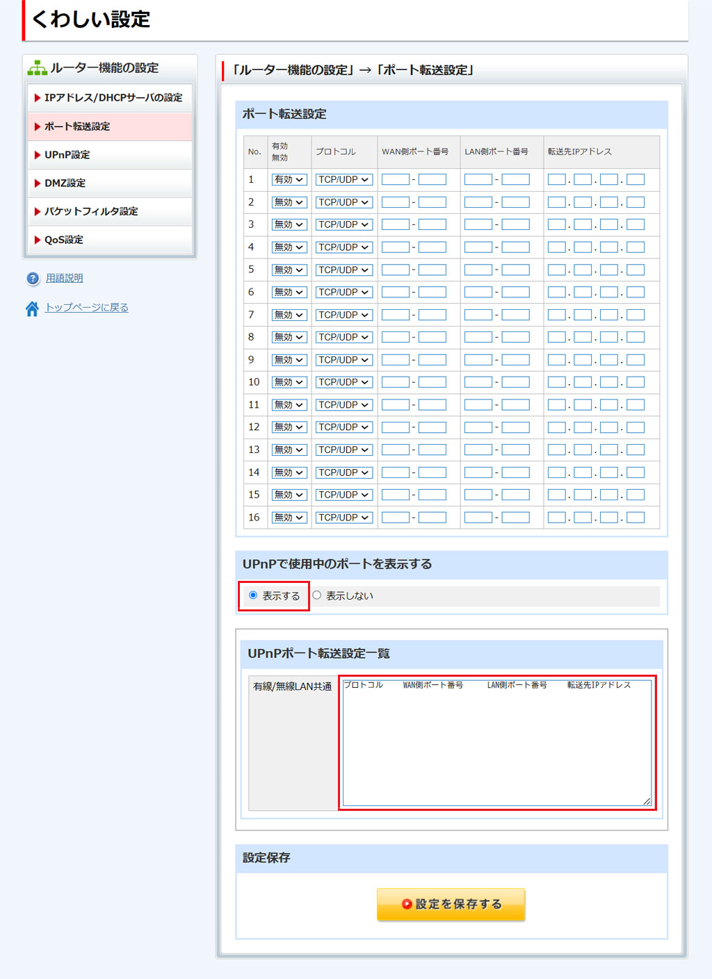 「UPnPで使用中のポートを表示する」で[表示する]を選択すると、UPnP機能により自動でポート転送設定されている情報が表示されます。
