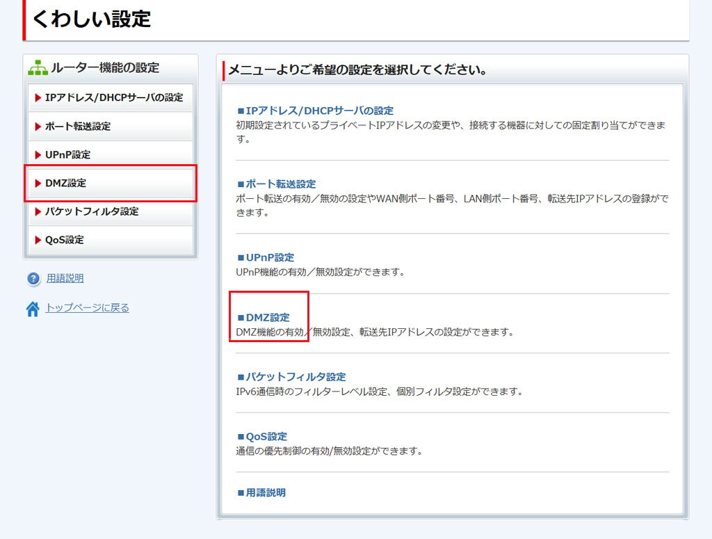 [DMZ設定]をクリックします。