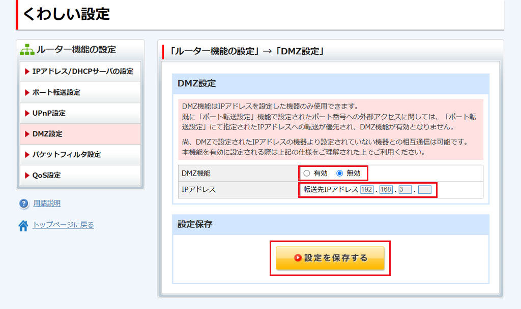 DMZの[有効]または[無効]を選択します。有効にした場合は、転送先のIPアドレスを入力します。