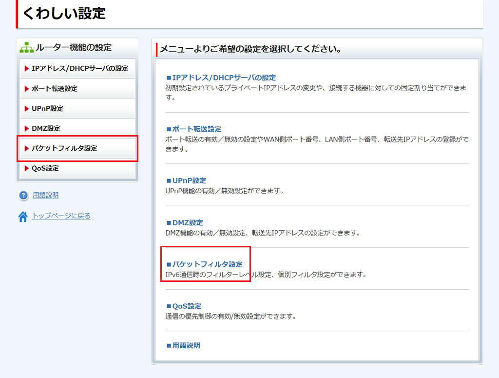[パケットフィルタ設定]をクリックします。