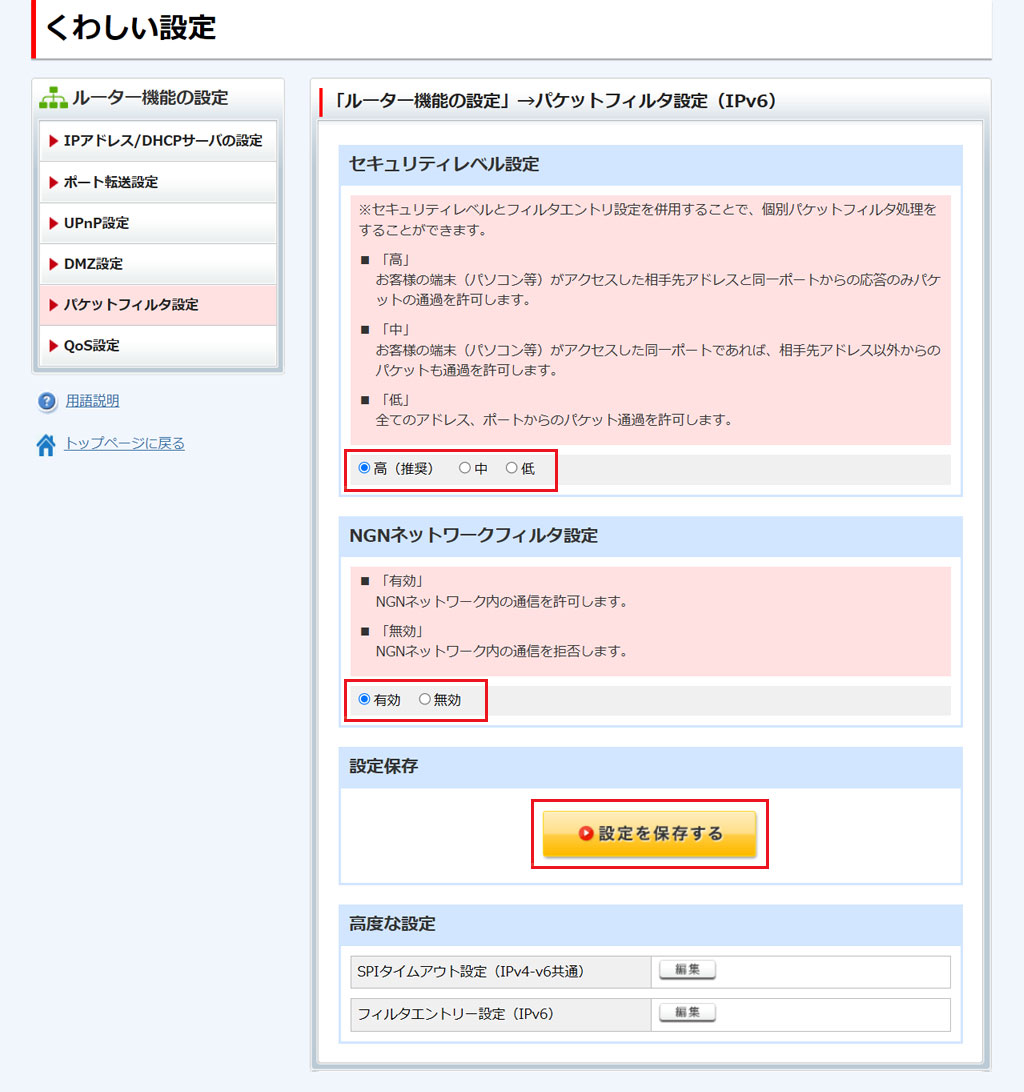 「セキュリティレベル設定」、「NGNネットワークフィルタ設定」を設定し、[設定を保存する]をクリックします。
