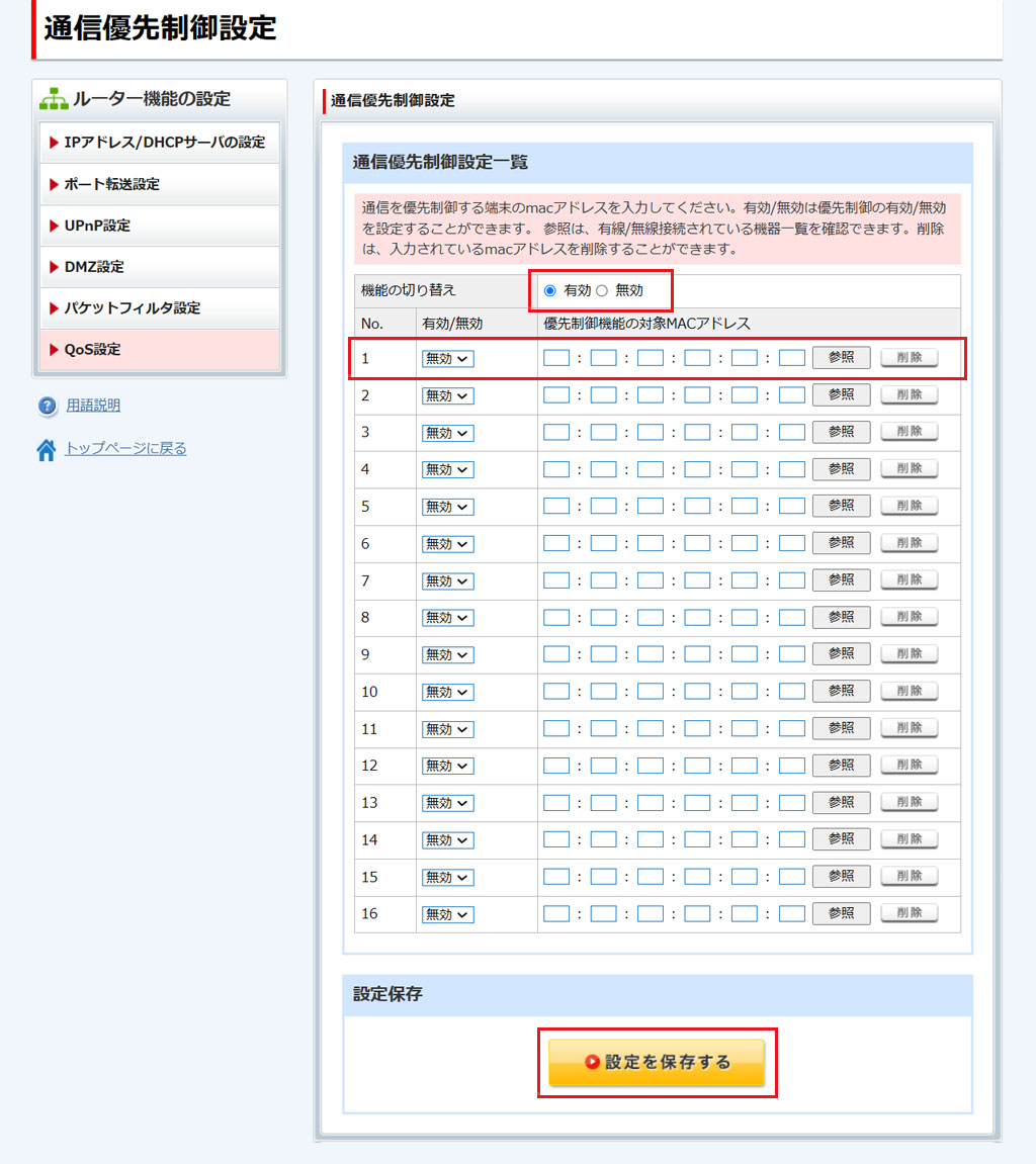 有効にした場合は、優先したい機器のMACアドレスを入力した上、[有効]にしたうえで、[設定を保存する]をクリックします。