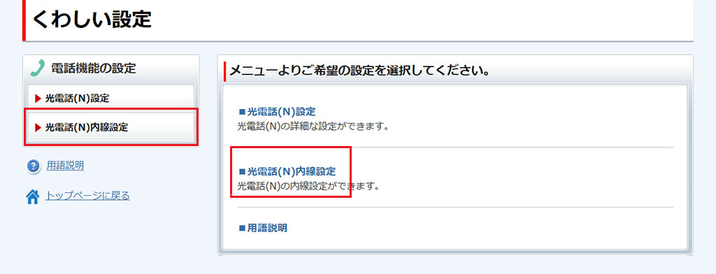 [ 光電話(N)内線設定]をクリックします。