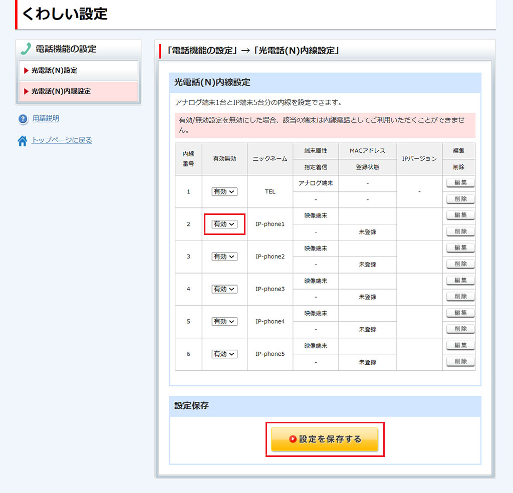 内線電話として使いたい端末のプルダウンを[有効]にして、 [設定を保存する]をクリックします。