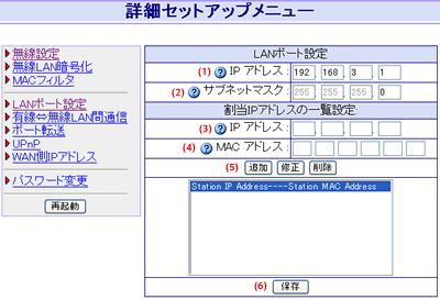 MACアドレス:(3)で設定したIPアドレスを割り当てたい機器