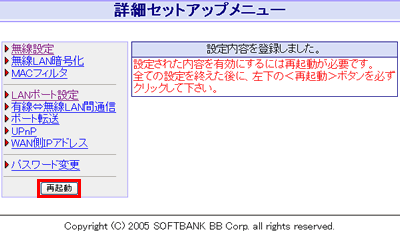 「設定内容を登録しました。」とメッセージが表示されたら、左側のメニューから「再起動」をクリックします。