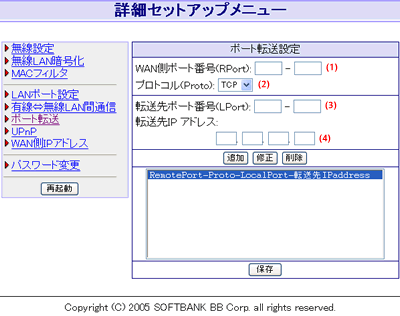 (1)WAN側ポート番号:利用するアプリケーションの説明書などで指定されたポート番号
