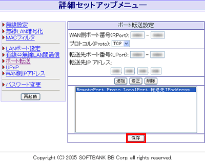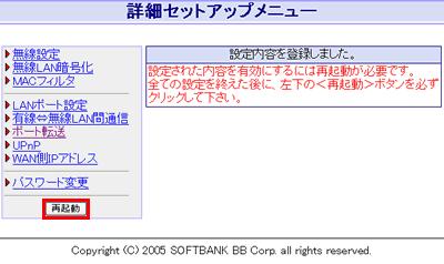 再起動が終わると、設定は完了です。※ポート転送設定が有効になることにより、アプリケーションに制約が出る場合があります。問題解決方法などについては、ソフトウエアメーカーまでお問い合わせください。