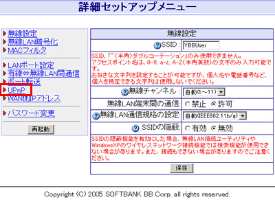 Play:パソコンや周辺機器をネットワークへ簡単に接続するための規格)を設定します。UPnPを利用することで、ルーターに接続したパソコンからでも、特別な設定なしにインスタントメッセンジャーやネットワーク対応ゲームを利用することができます。