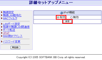 「UPnP」欄で「有効」を選択します。選択後、「保存」をクリックします。