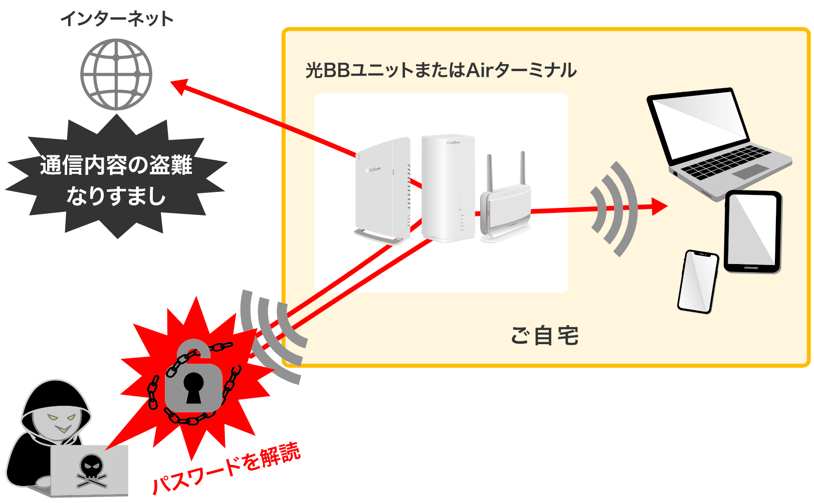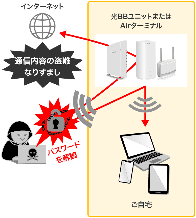 通信内容の盗難や、なりすましを防ぐためにセキュリティ設定を強化(初期設定を変更)しましょう。