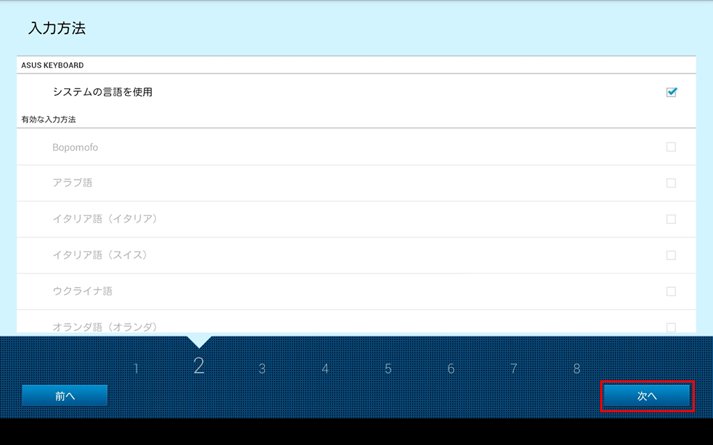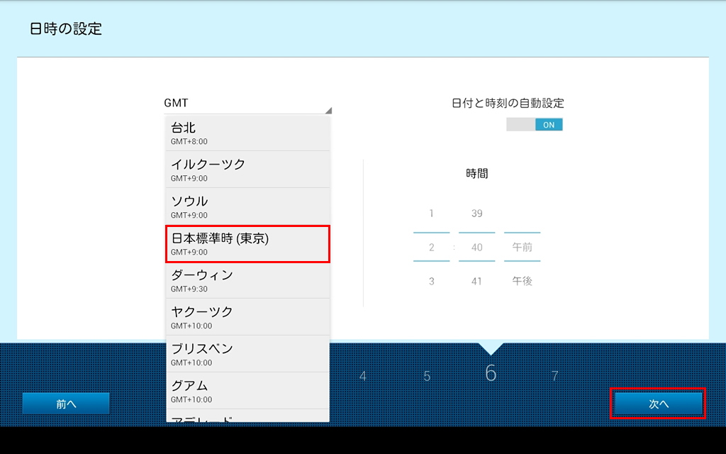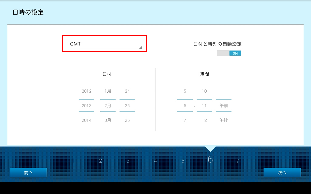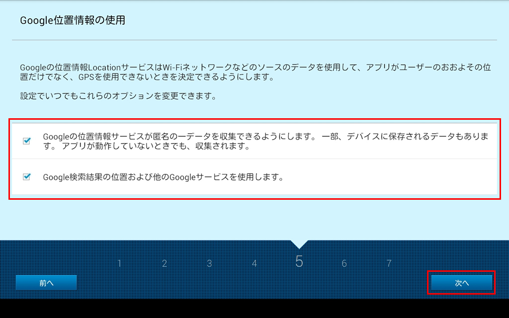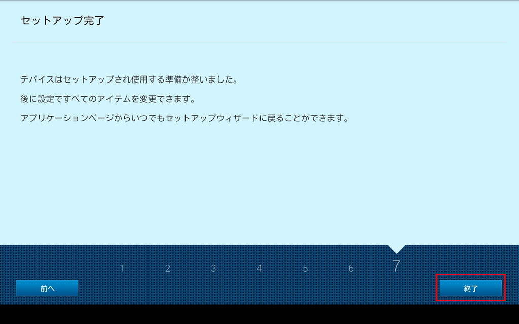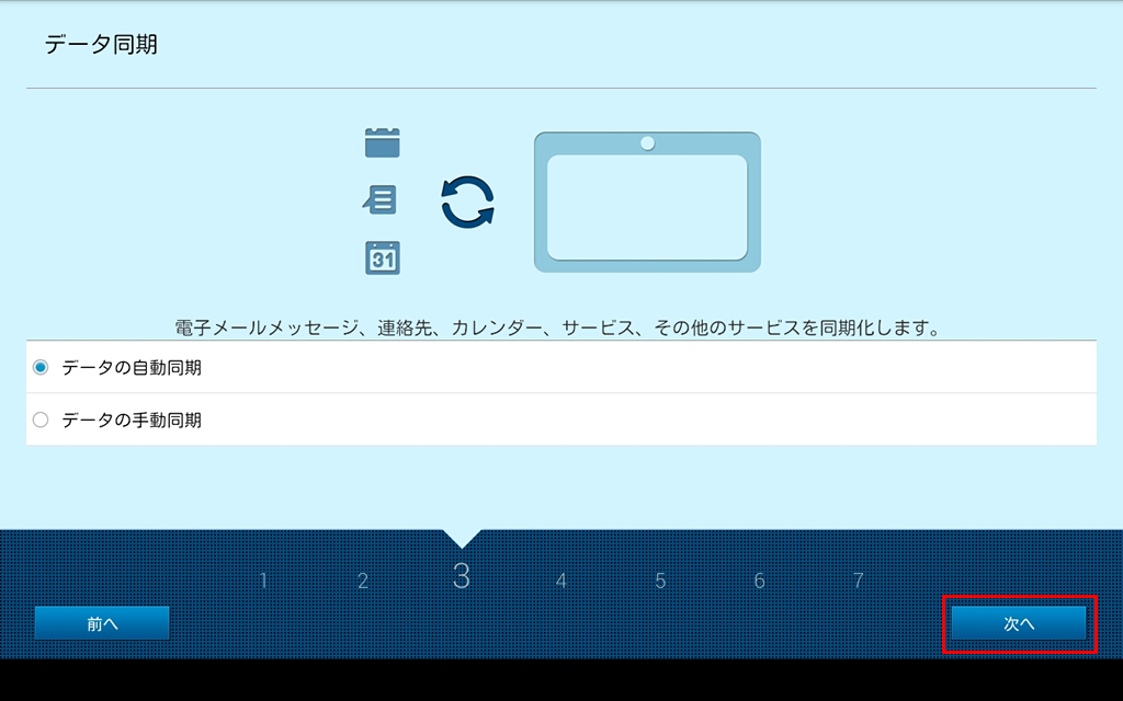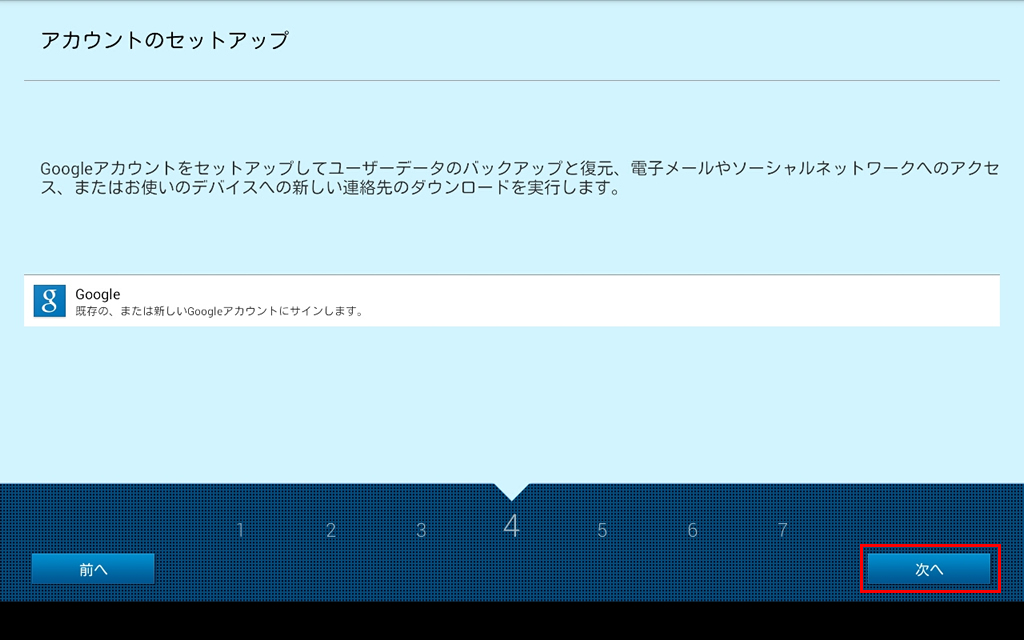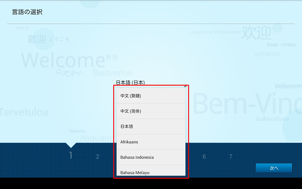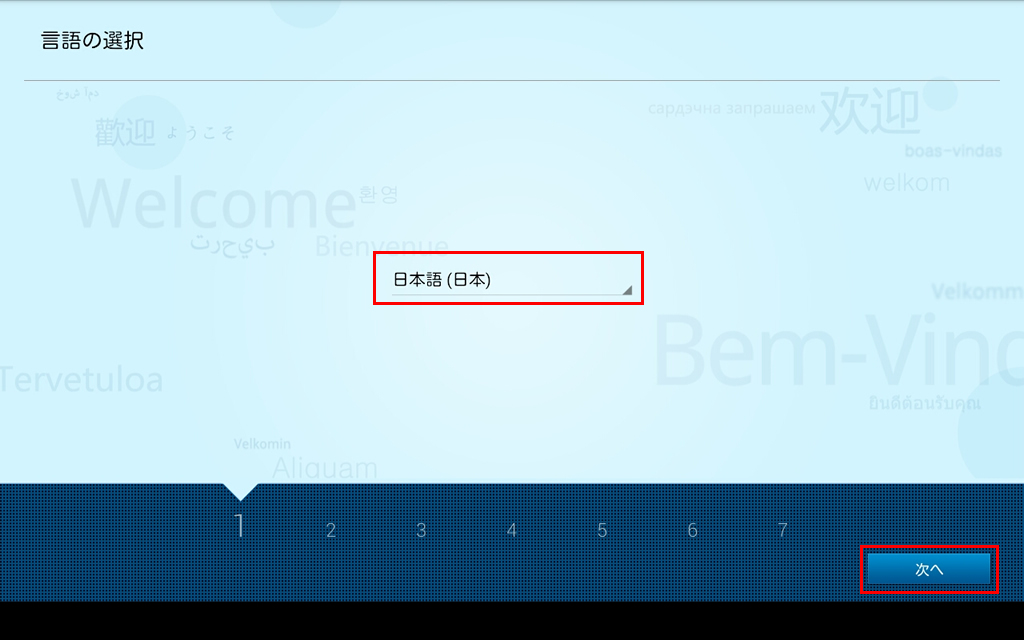 タブレットを最初に起動した時に表示されるセットアップウィザードの設定手順です。