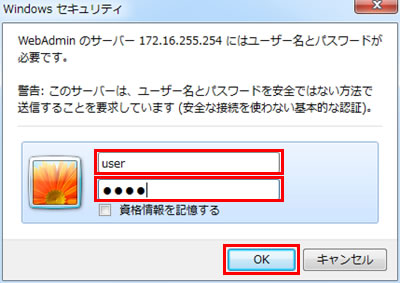 表示された画面に、「ユーザー名」、「パスワード」共に「user」を入力し、「OK」をクリックします。