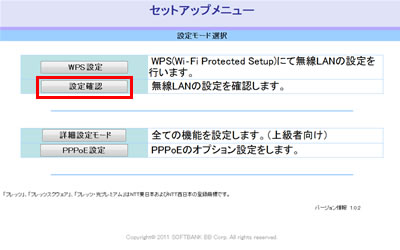 光BBユニットに設定されているSSID、暗号化キー(WEPキー、事前共有キー)などの無線LAN設定に必要な情報をを確認する手順です。