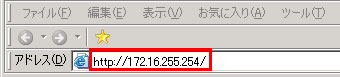 Internet Explorerを起動し、アドレス入力欄に「http://172.16.255.254/」と入力し、キーボードの「Enter」キーを押します。下記リンクをクリックすることでも、「セットアップメニュー」を表示できます。