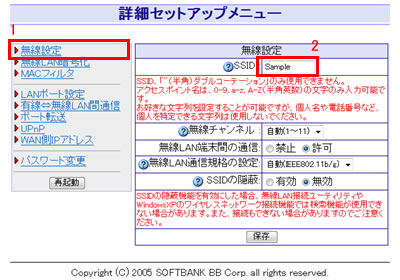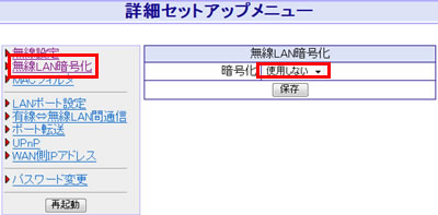 2. 「SSID」の欄に入力されている値が現在設定されているSSIDです。3. 左メニューの「無線LAN暗号化」をクリックします。