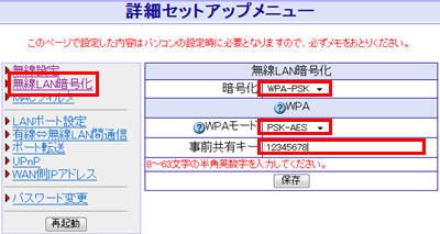 - 利用している暗号化の種類が必要な場合もあります。その場合は、「WPAモード」で選択しているPSK-AESもしくはTKIPを設定してください。