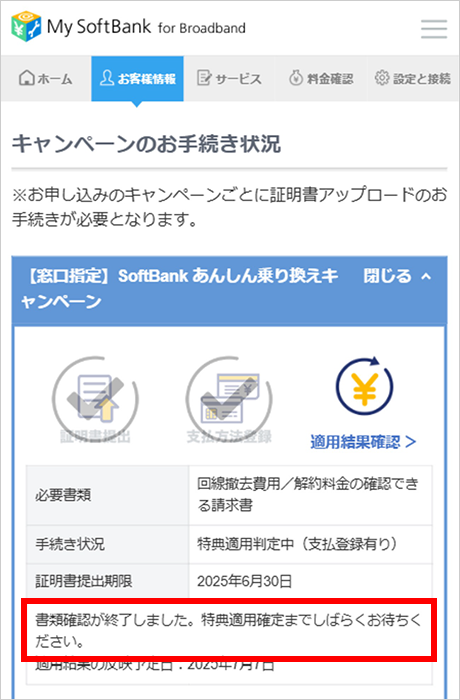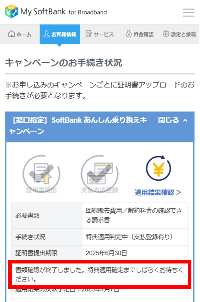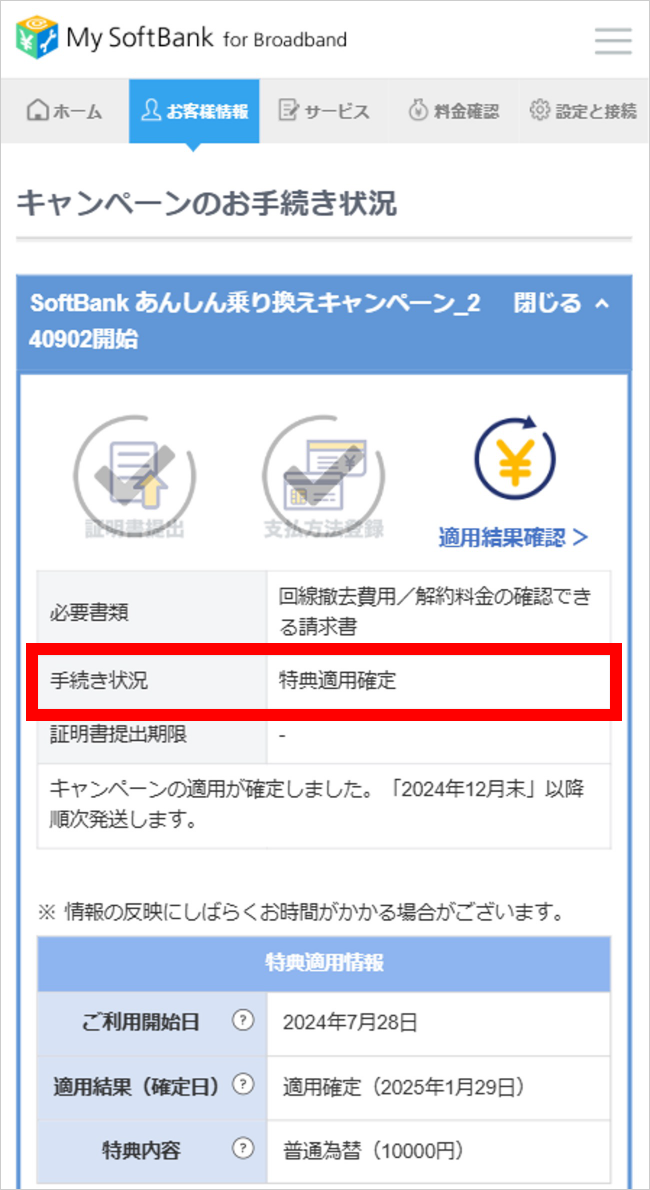 手続き状況が「特典適用確定」となっていれば、キャンペーンの適用が確定されています。