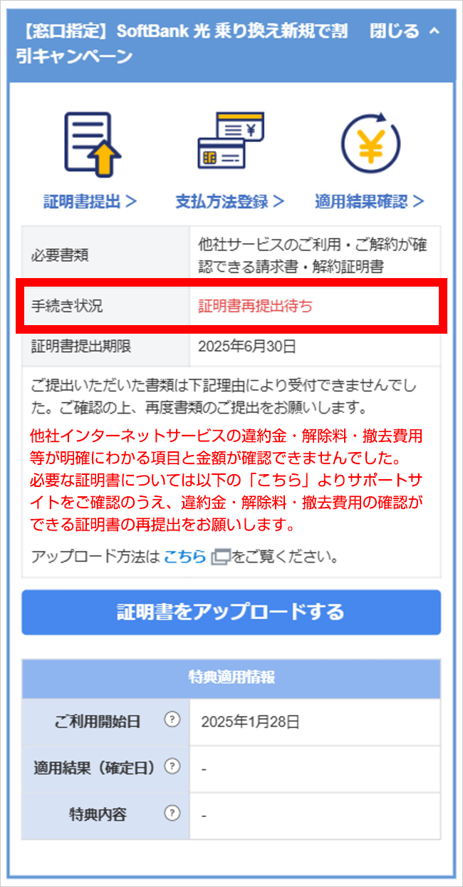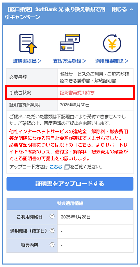 手続き状況が「証明書再提出待ち」の場合、対応が必要です。