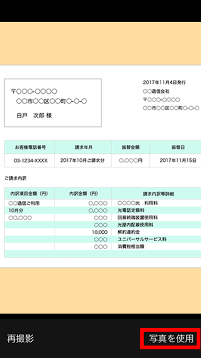 ①、②、③、④が記載されている他社サービスの請求書等をご用意下さい。書類での証明書がなく、他社会員サイトよりご利用料金を閲覧しているお客さまは、必要情報が記載されているウェブ画面のスクリーンショットまたは写真をご用意ください。