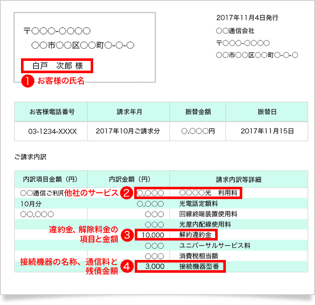- 解約時の違約金・解除料金・撤去工事費等の項目と金額