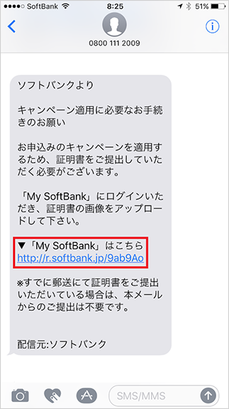 SMSに記載されているURL(「My SoftBank」はこちらの下)をタップして、