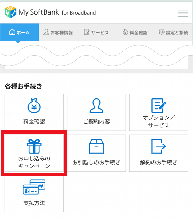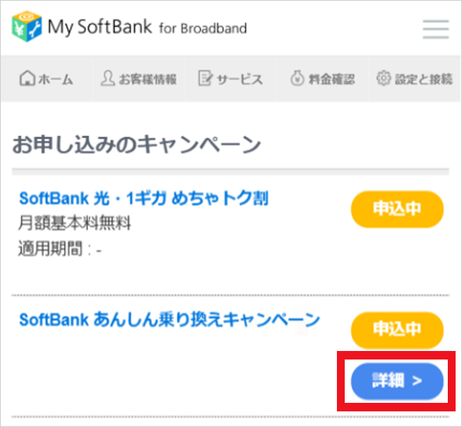 My SoftBankの「ホーム画面」の下部にある「お申し込みのキャンペーン」ボタンを選んでください。