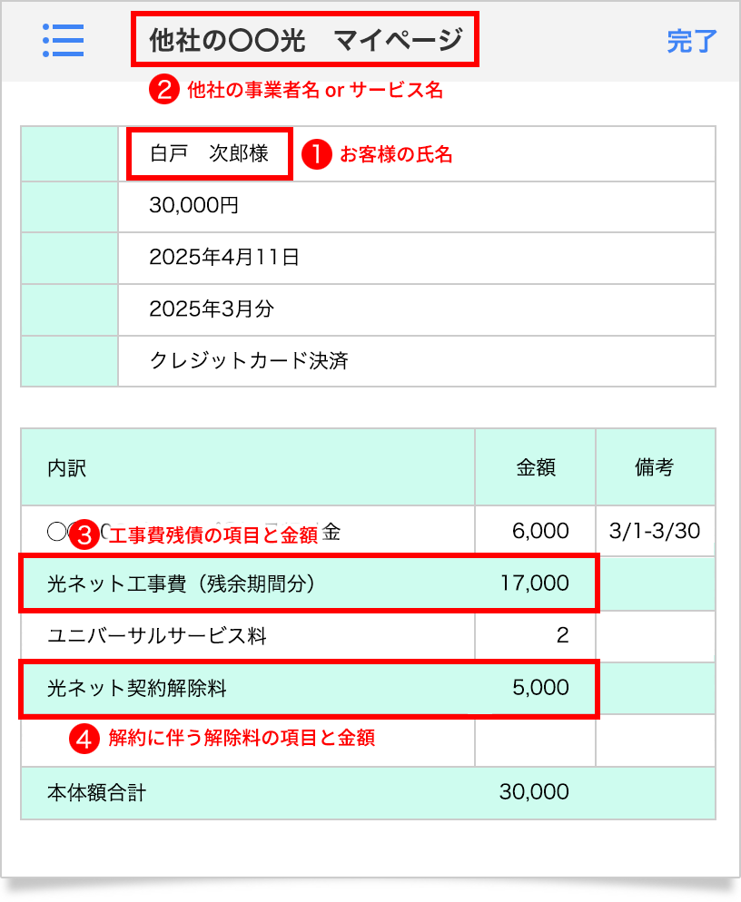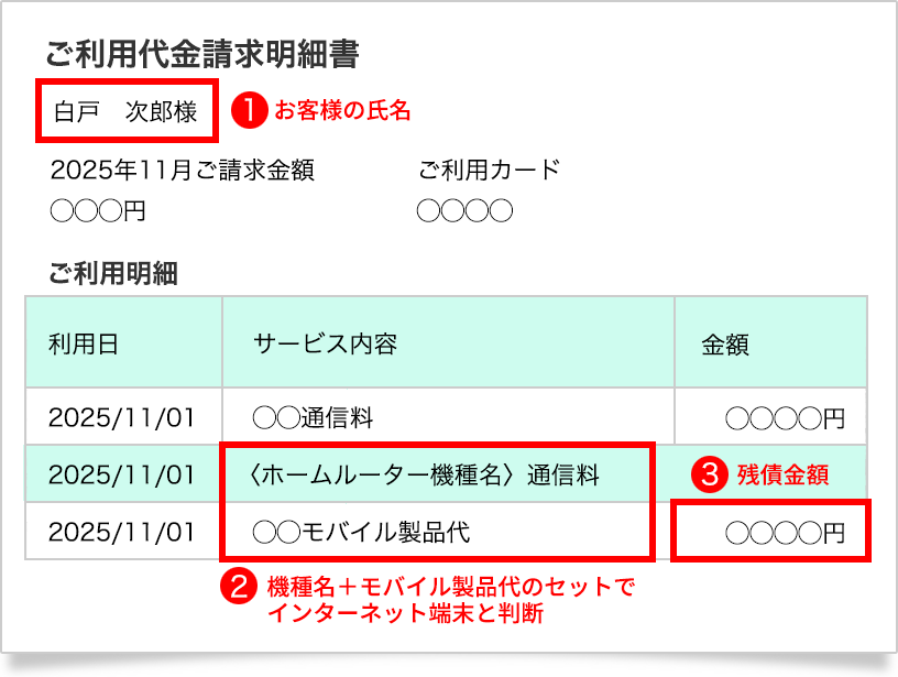 単月の他社請求書/請求内訳書では端末の割賦残債などの金額は確認できますが、「他社インターネットサービスの接続機器であること」や「他社インターネットサービスを解約した」ことの確認ができません。