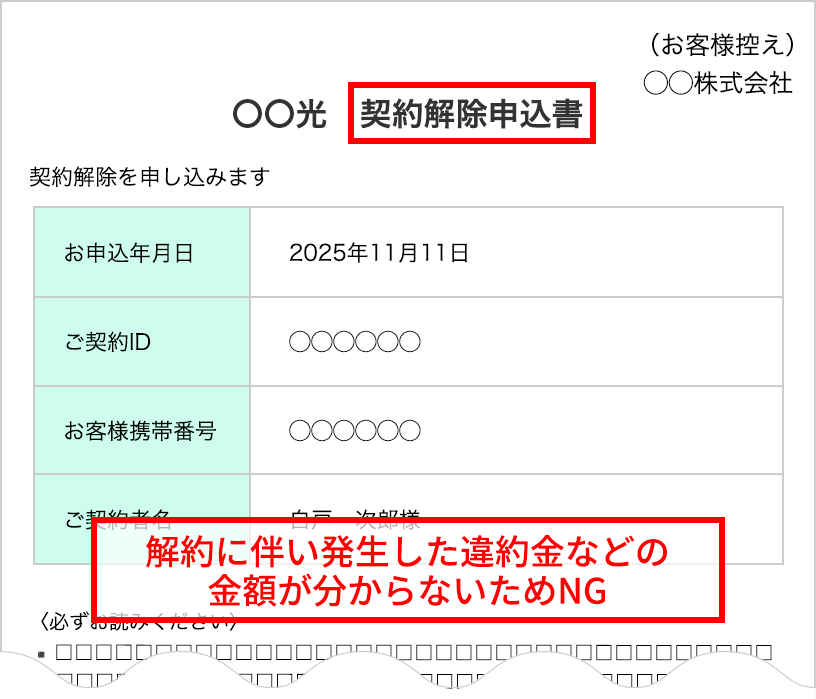 他社サービスの契約更新案内について解約前の案内事項として記載されているもの(契約更新月以外に解約する場合●●円かかる等の記載)は、お客様が解約のお手続きを実施していることの確認ができません。