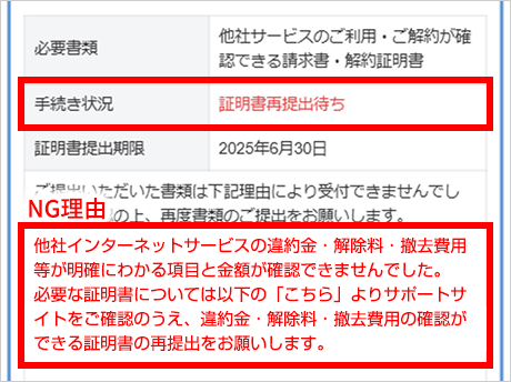 「他社インターネットサービスの解約時に発生した違約金や解除料、撤去費用」とわかる項目が記載された証明書の再提出をお願いします。