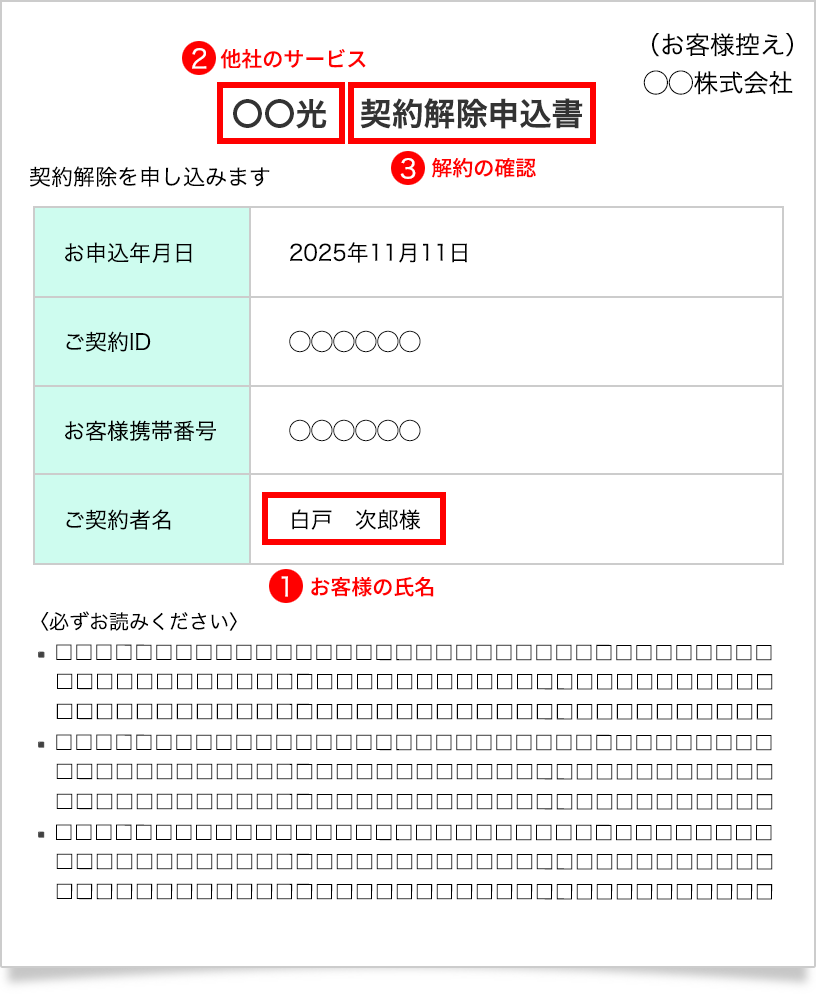 ①~③に記載された他社サービスの解約証明書、または解約手続きを申請していることが確認できる書面をご用意ください。