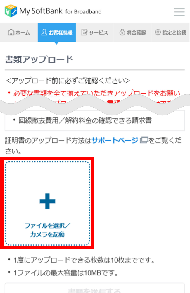 カメラアプリで撮影した証明書をMy SoftBankからアップロードできるので、スマートフォンからの提出がおすすめです。