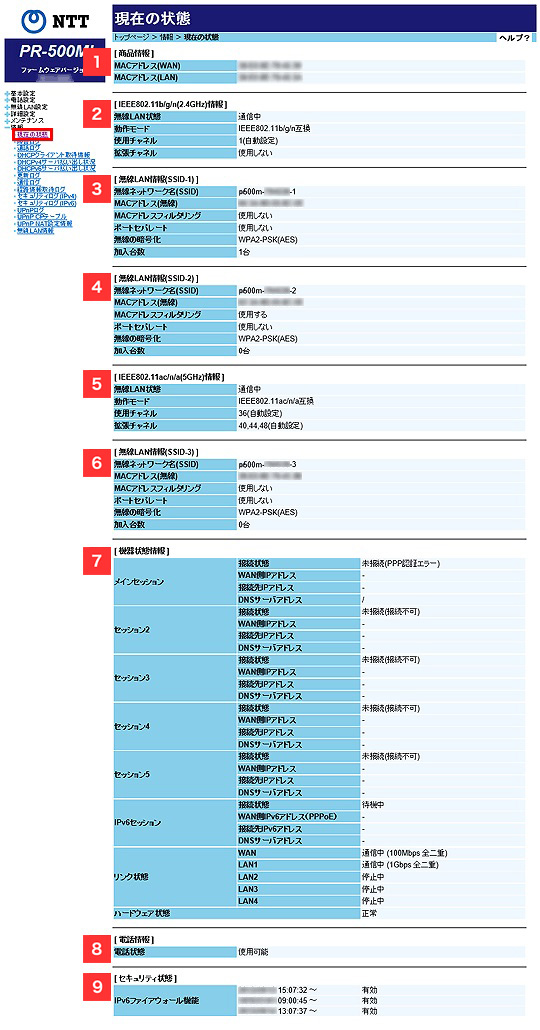 LAN4:現在のLAN4の接続状態を表示します。ハードウェア状態 現在のハードウェアの状態(正常、異常)を表示します。 (8)電話情報 電話状態 「使用不可」「接続待ち」「使用可能」の3つ(機器によっては「接続中」をくわえて4つ)で表示します。 - 光電話(N)サービスをご利用の場合のみ