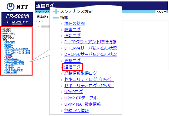 ログは最新のものから順に最大100件表示され、古いものから順に削除されます。[情報]をクリックして、[通信ログ]をクリックします。