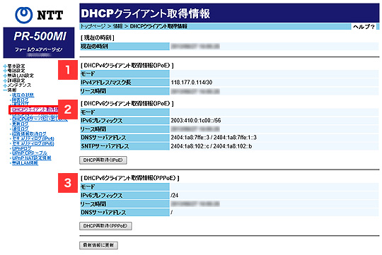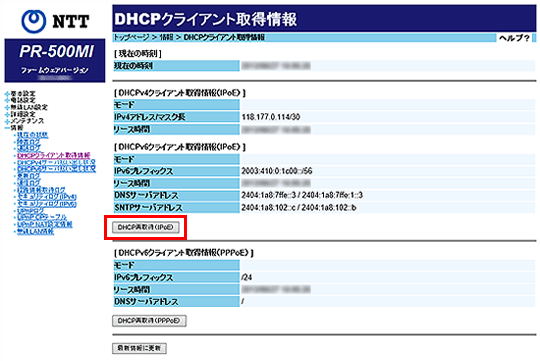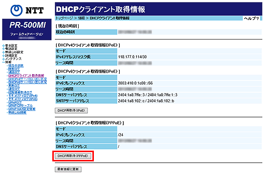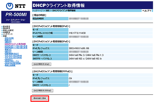 取得していない場合は「-」を表示します。DHCPv6クライアント取得情報(PPPoE)を再取得する場合 [DHCP再取得(PPPoE)]をクリックします。 最新情報に更新する場合 [最新情報に更新]をクリックします。
