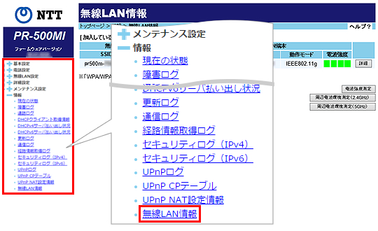 [情報]をクリックして、[無線LAN情報]をクリックします。