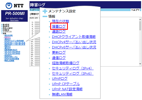 障害ログの内容を表示します。ログメッセージ 内容 機器起動 電源ONにより起動。 機器再起動 再起動により起動。 LANインタフェースリンクアップ LANインタフェースがリンクアップ。 LANインタフェースリンクダウン LANインタフェースがリンクダウン。 WANインタフェースリンクアップ WANインタフェースがリンクアップ。 WANインタフェースリンクダウン WANインタフェースがリンクダウン。 ひかり電話機能初期化成功 光電話(N)機能初期化を行い、再起動により初期化が成功。 ひかり電話機能初期化失敗 光電話(N)機能初期化を行うが、ファームウェア更新や緊急呼通話中のため初期化が失敗。 ひかり電話以外の機能初期化成功 光電話(N)以外の機能初期化を行い、再起動により初期化が成功。 ひかり電話以外の機能初期化失敗 光電話(N)以外の機能初期化を行うが、ファームウェア更新や緊急呼通話中のため初期化が失敗。 時刻の同期成功 時刻同期に成功したとき。 時刻の同期失敗 時刻同期に失敗したとき。 PPP-LCPの確立 PPP-LCPの確立成功。 PPPの認証成功 PPP-LCPの認証成功。 PPPの認証失敗 PPP-LCPの認証起因による確立失敗。 PPP-IPCPの確立 PPP-IPCPの確立成功。 PPPoEセッション開始成功 PPPoEセッション開始成功。 PPPoEセッション開始失敗 PPPoEセッション開始失敗。 電話使用可能 光電話(N)および内線電話の発着信が可能。 電話使用不可 光電話(N)および内線電話の発着信が不可。
