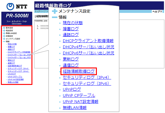 ログは最新のものから順に最大20件表示され、古いものから順に削除されます。[情報]をクリックして、[経路情報取得ログ]をクリックします。