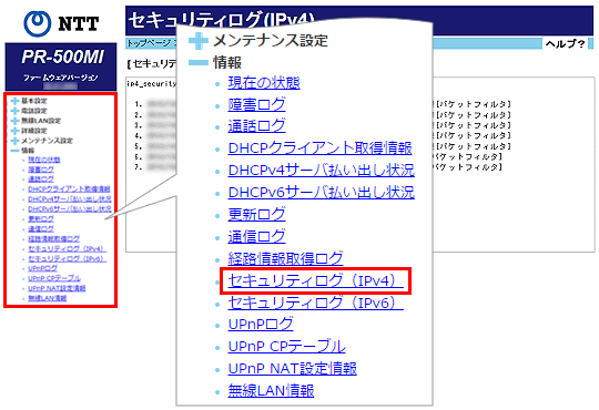 [情報]をクリックして、[セキュリティログ(IPv4)]をクリックします。