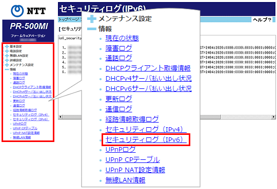 [情報]をクリックして、[セキュリティログ(IPv6)]をクリックします。