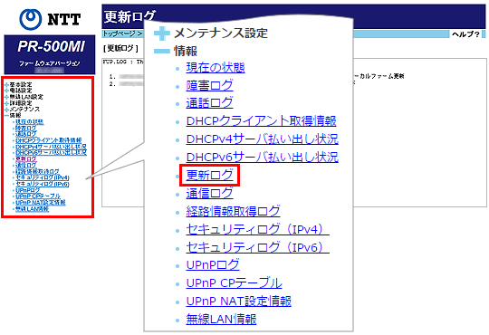 ログは最新のものから順に最大20件表示され、古いものから順に削除されます。[情報]をクリックして、[更新ログ]をクリックします。