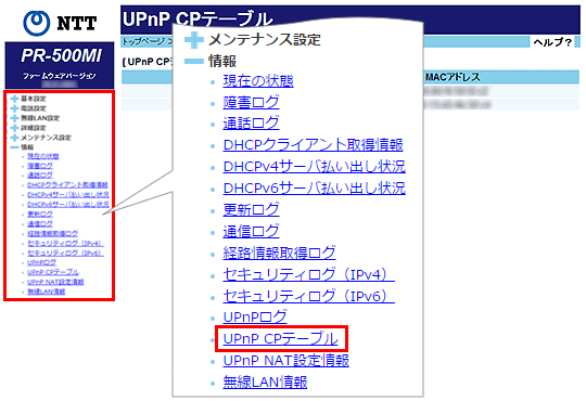 [情報]をクリックして、[UPnP CPテーブル]をクリックします。