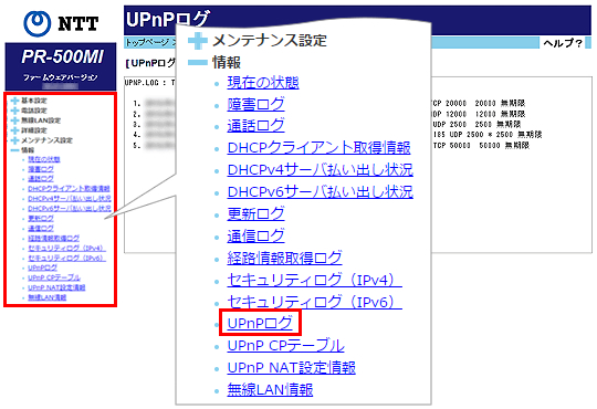 最大100件までのログが表示され、古いものから順に削除されます。[情報]をクリックして、[UPnPログ]をクリックします。