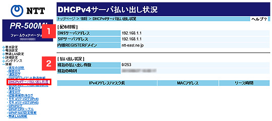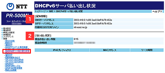 (1)配布情報 DNSサーバアドレス DHCPv6サーバのDNSサーバアドレスを表示します。 SIPサーバアドレス DHCPv6サーバのSIPサーバアドレスを表示します。 内線REGISTERドメイン DHCPv6サーバの内線REGISTERドメインを表示します。 (2)払い出し状況 現在の払い出し件数 DHCPv6サーバの払い出し件数を表示します。 現在の時刻 現在時刻を表示します。 IPv6アドレス/マスク長 IPv6アドレスとマスク長を表示します。 MACアドレス MACアドレスを表示します。 リース時間 リース時間を表示します。