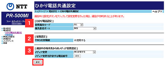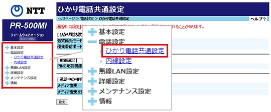 [電話設定]をクリックして、[ひかり電話共通設定]をクリックします。