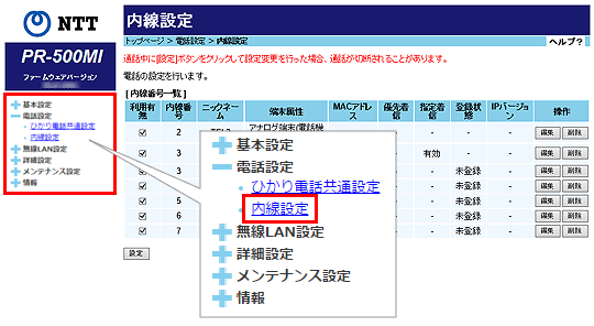 [電話設定]をクリックして、[内線設定]をクリックします。