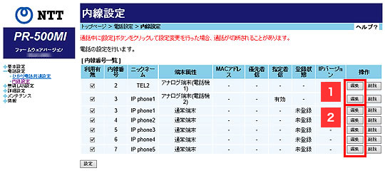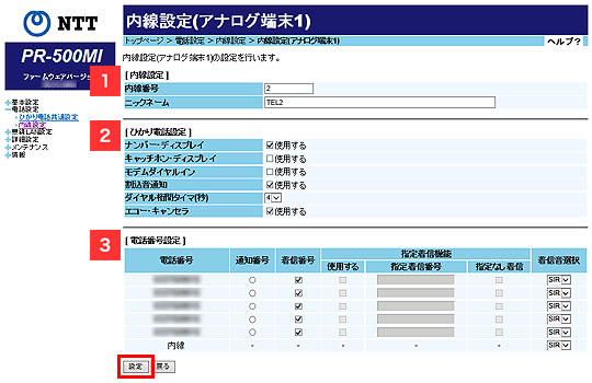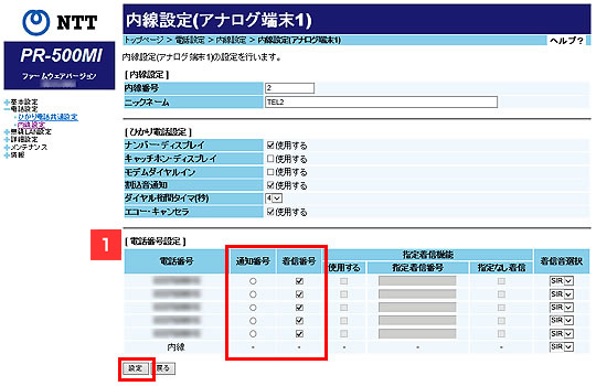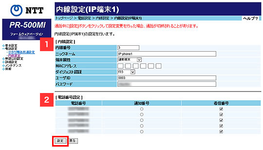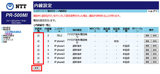 使用する内線番号の「利用有無」のチェックボックスを入れて、[設定]をクリックします。