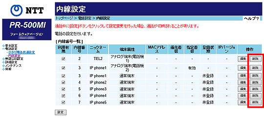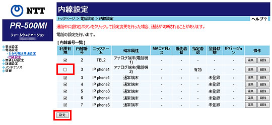 使用する内線番号の「利用有無」のチェックボックスをはずして、[設定]をクリックします。