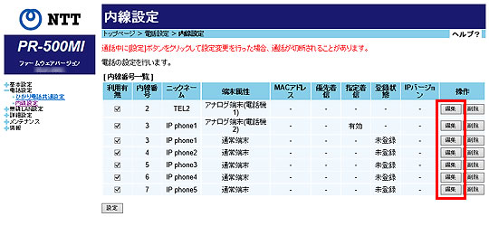各内線番号に割り当てられたIP端末のMACアドレスです。変更することができます。